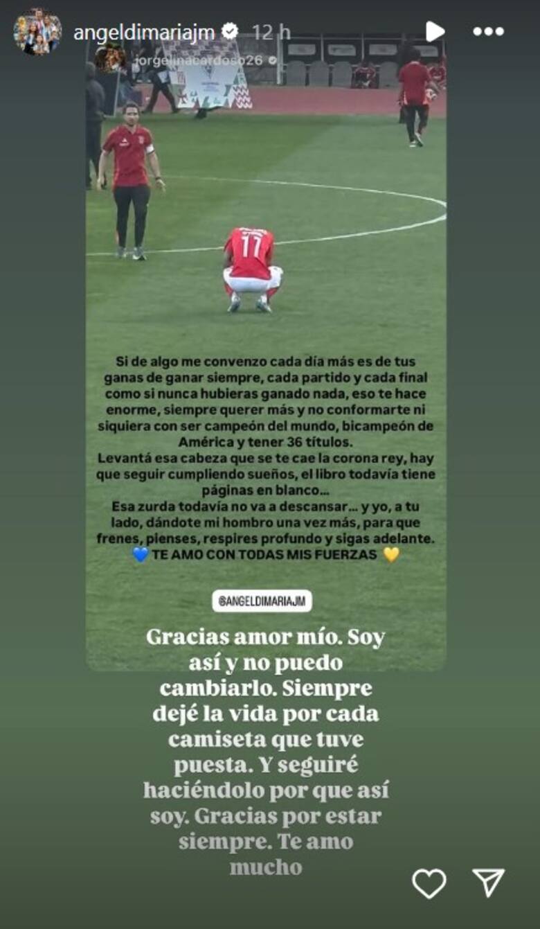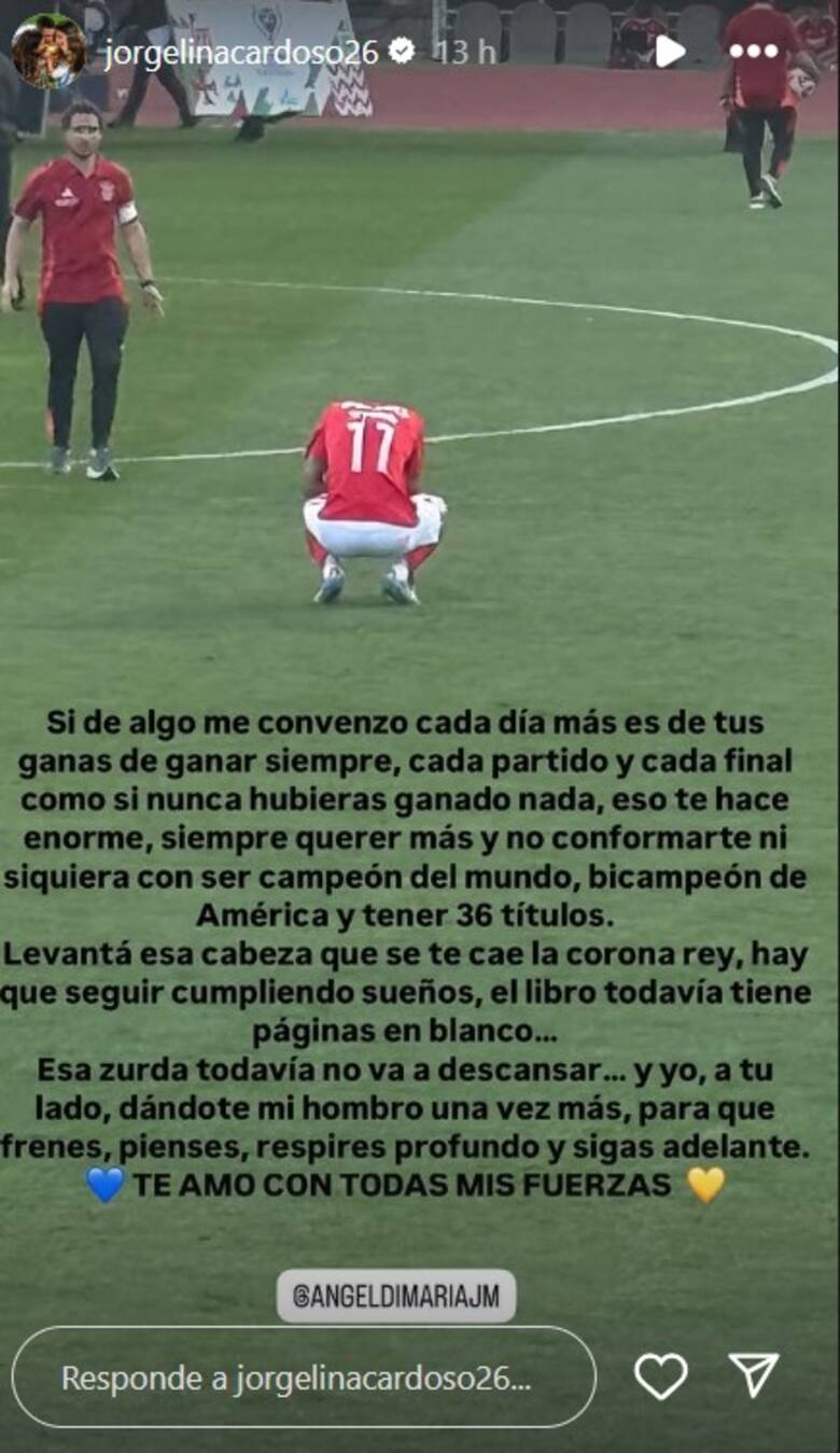 Por último, Di María expresó su gratitud hacia Cardoso, quien acompañó -una vez más- al futbolista tanto en sus éxitos deportivos como en las frustraciones por no poder lograr los objetivos.