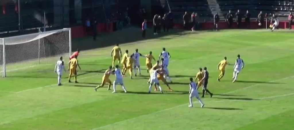 A los 5 minutos hubo una jugada dudosa en el área de Mitre. Cayó el pibe Córdoba, el árbitro no cobró nada y estalló el banco de suplentes. El DT Yllana se fue expulsado.