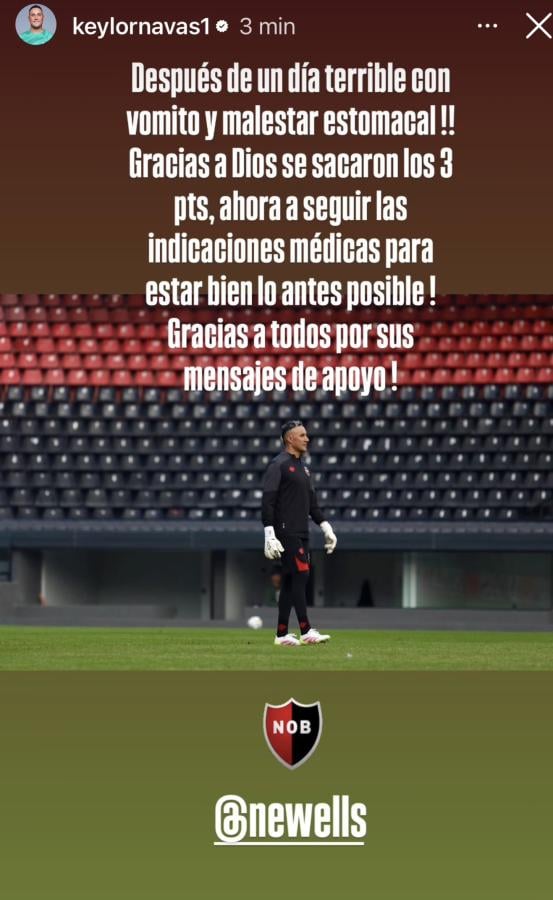 El experimentado arquero confesó que «después de un día terrible con vomito y malestar estomacal, gracias a Dios se sacaron los 3 puntos, ahora a seguir las indicaciones médicas para estar bien lo antes posible. Gracias a todos por sus mensajes de apoyo».