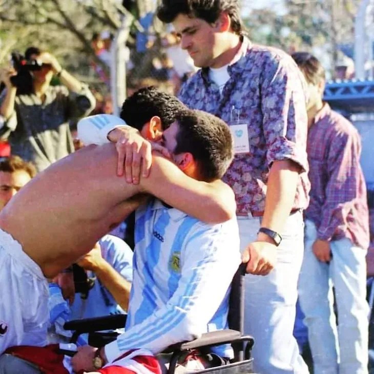 A los cinco minutos del segundo tiempo, en el partido entre la selección de fútbol rápido y Unión de Totoras, Maradona detuvo el juego. Corrió hacia Hernán Fonseca, que miraba desde la línea de cal, le dio su camiseta y un abrazo que emocionó a todos. “Dale loco, metele, hay un montón de gente que te quiere ver bien… mis piernas son tus piernas”, le dijo Diego.