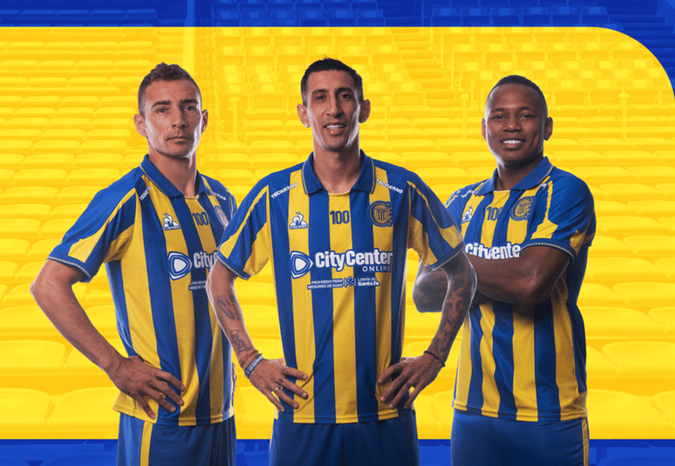 La camiseta titular se presenta como una síntesis perfecta entre tradición e innovación. El clásico bastoneado amarillo y azul, sello inalterable de Rosario Central, incorpora una construcción en tejido jacquard de poliéster con textura piqué que potencia su impronta retro desde una mirada contemporánea. Los escudos bordados, incluyendo las ocho estrellas, refuerzan el peso histórico del club, mientras que en el centro del pecho emerge el número 100, construido a partir de una trama de píxeles que evocan las icónicas butacas del estadio. Este recurso gráfico se replica en el tejido del cuello tipo polo y en los puños de las mangas, en líneas de color amarillo sobre base azul, como un guiño a cada historia que habita en las tribunas del Gigante.
